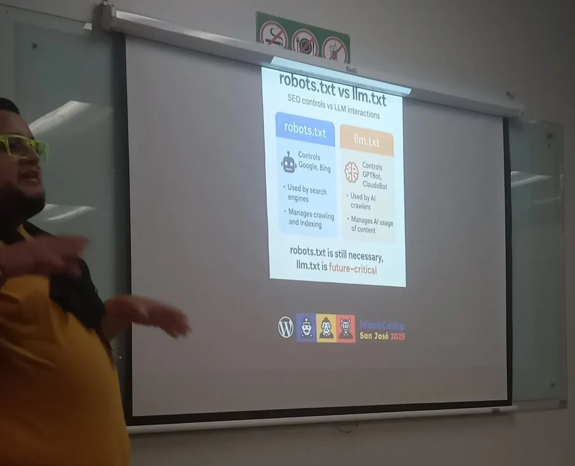 Después de disfrutar la comparsa y ver la agenda en el sitio web oficial de WordCamp procedimos a nuestra primera charla. ” El SEO está muerto, pero bienvenido sea el GEO ” No se tomen en serio lo del SEO está muerto. Es un chiste interno, anda, en serio. Logramos entrar a la sala a tiempo y tomar asientos al frente. Después de un ligero inconveniente técnico y el tiempo corriendo contra él, se presentó Allan Andres de Parnerd. ¡Wow! qué manera de hacer una charla divertida, informativa y todo en tiempo record. Se pasó el tiempo volando pero entendimos todo. ¿Será que tuvimos suerte y elegimos a la primera la mejor charla del día? Antes de irnos le agradecí a Allan y me aseguré de hacerle saber que me encantó su charla, aunque lo presionaron con el tiempo, lo manejó fenomenal.